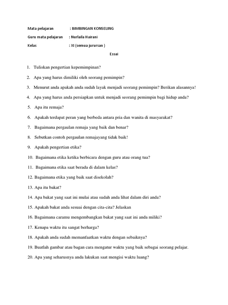 Contoh Soal Bimbingan Konseling Smp Kelas 7 Contoh Soal Terbaru from imgv2-1-f.scribdassets.com Tugas bimbingan konseling kelas 8. Maybe you would like to learn more about one of these? We did not find results for: Check spelling or type a new query.