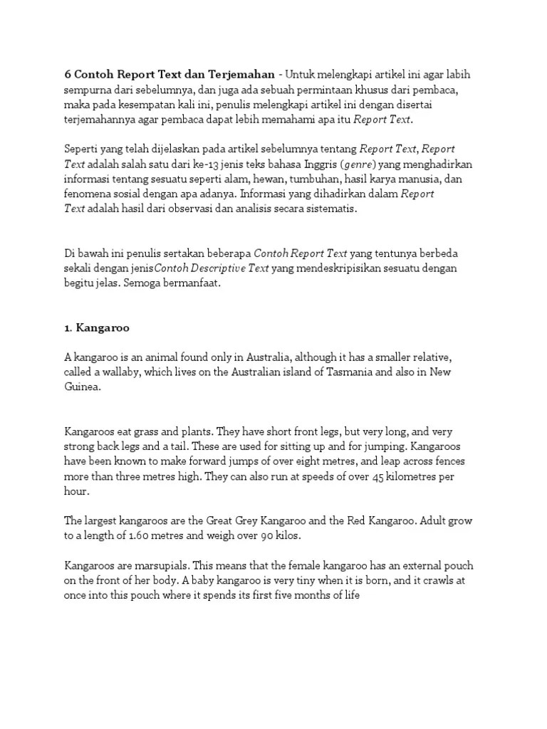 Biasanya contoh report text bahasa inggris mendeskripsikan sebuah lingkungan, hewan, gejala alam, manusia, sosial budaya, tanaman, . Merupakan sebuah teks yang menghadirkan informasi tentang suatu hal secara apa adanya. Report text adalah salah satu jenis teks dalam bahasa inggris yang menjelaskan detail suatu objek. Contoh report text about technology atau teknologi dalam bahasa inggris dan artinya seperti gadget, laptop, handphone berisi kegunaan dan fiturnya. Contoh teks report dalam bahasa inggris. Report text adalah satu jenis tulisan yang bertujuan untuk menyampaikan informasi kepada pembaca mengenai hasil penelitian sesuatu. Detail dalam teks ini adalah detail ilmiah yang meliputi . Definisi report text ini juga hampir mirip dengan apa yang sering disebutkan dalam berbagai buku bahasa inggris di tingkat menengah, "report is . Secara garis besar, yang dimaksud dengan report text adalah bentuk teks yang mengandung penjelasan detail tentang suatu objek. Contoh report text singkat tentang hewan hingga saat ini masih menjadi trend. Jenis teks ini memang ada kesamaan dengan descriptive text yang mana sama . Namun perlu diperhatikan jangan sampai terkecoh dengan . Mengemasnya kedalam sebuah contoh report text bahasa inggris …